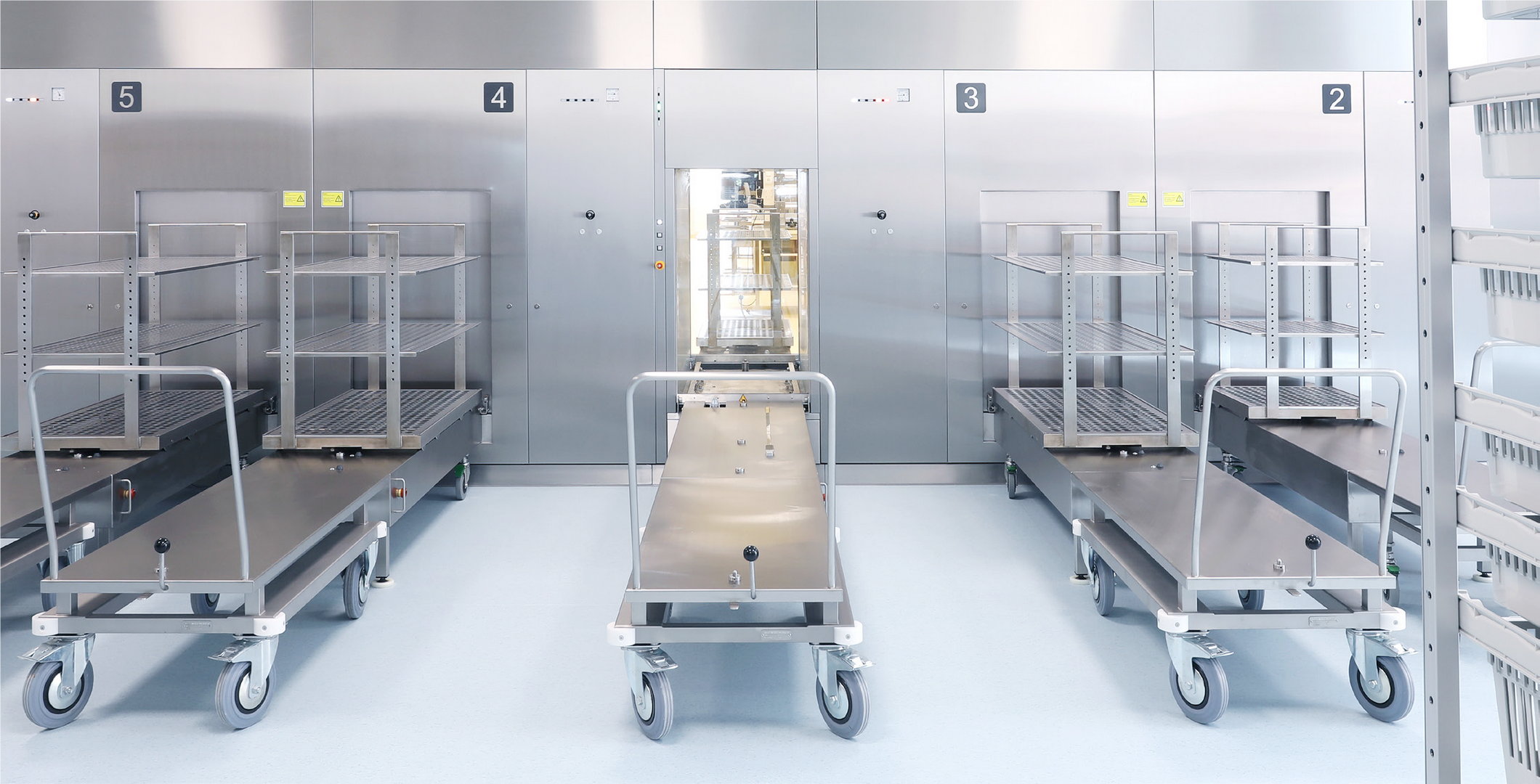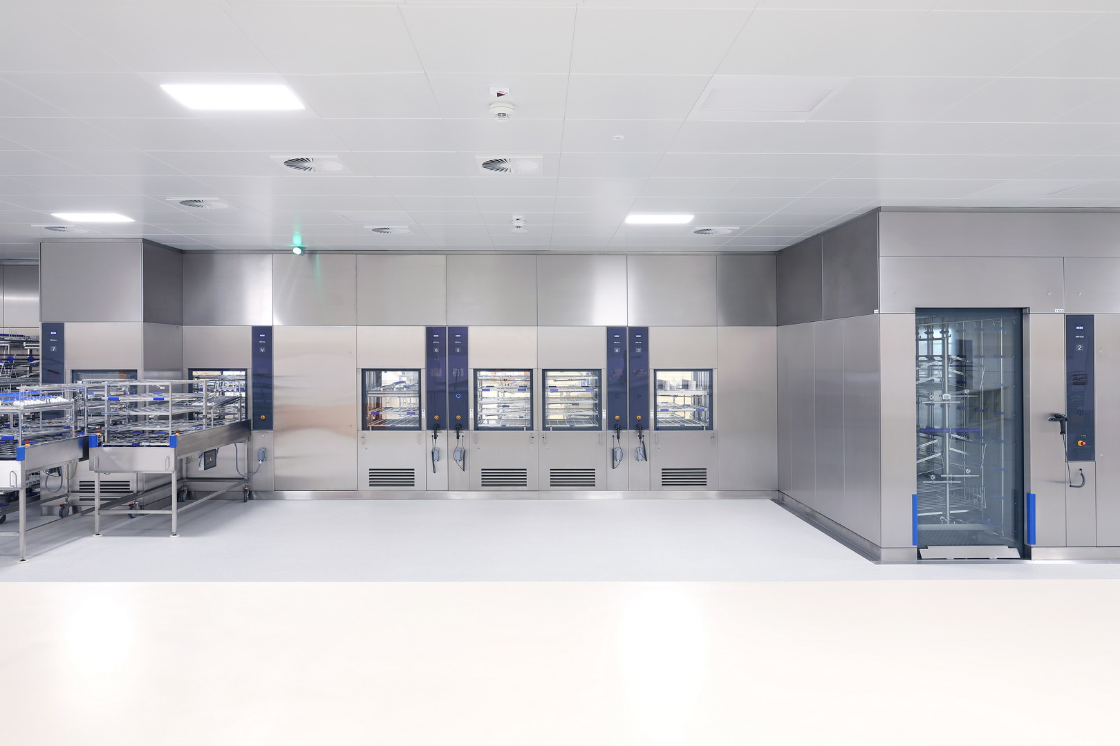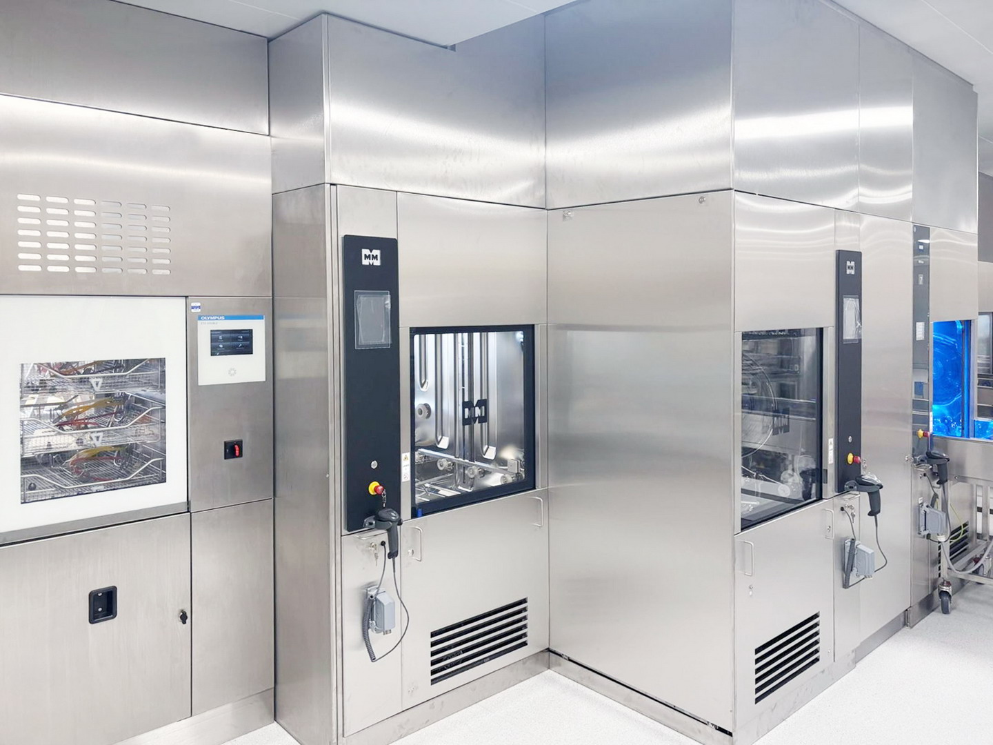 Специально разработанное устройство возврата стерилизационных и моечных тележек позволяет им проходить за пределы стерилизационных и моечных камер, что ускоряет движение инструментов и исключает ненужные простои. Всё это дополняется системой широкоэкранных дисплеев, которые отображают состояние работы стерилизаторов и моечных машин в режиме реального времени, включая оставшееся время отдельных циклов.